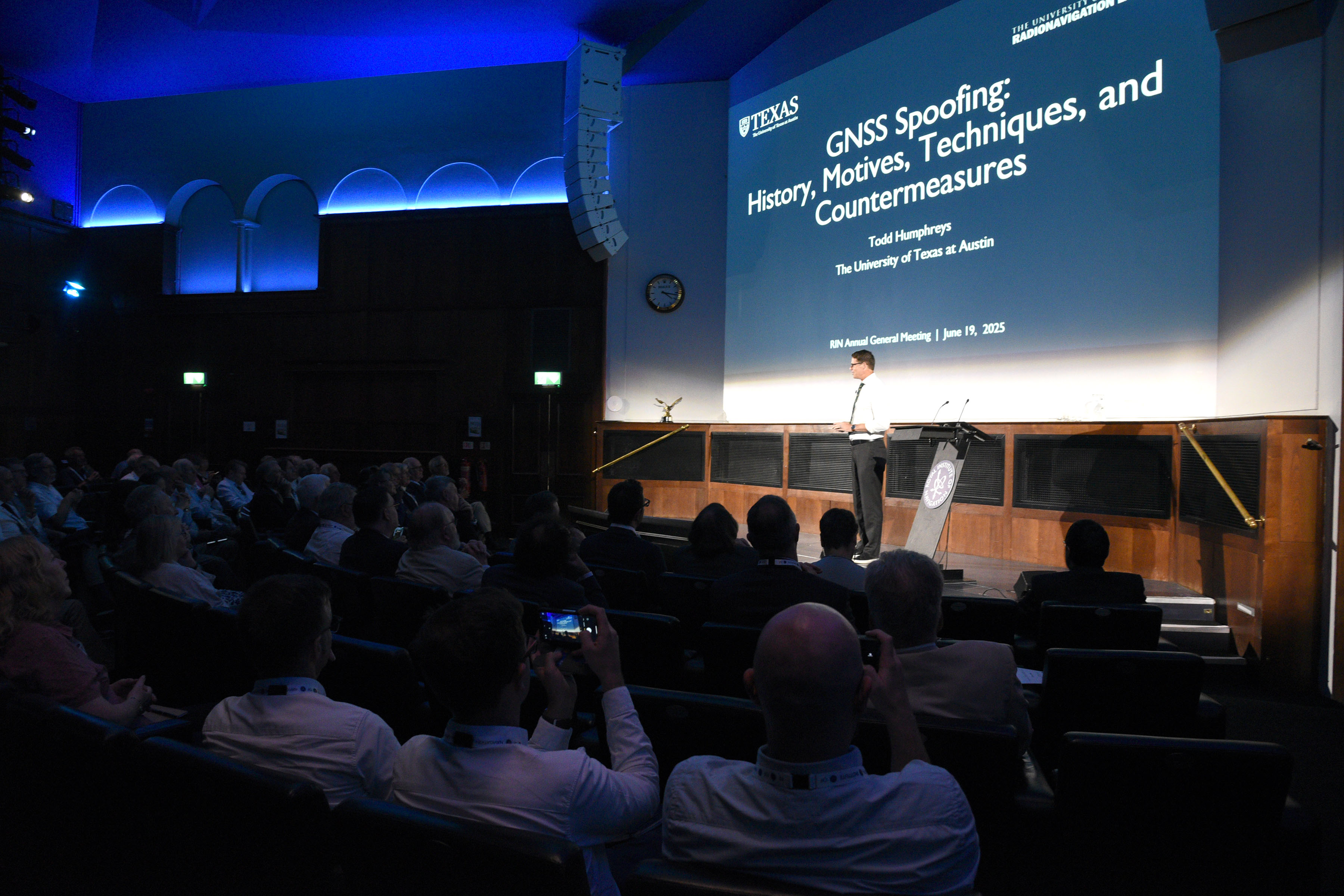 Dr Todd Humphreys (pictured below) gave a brilliantly illustrative lecture which examined the motives, patterns, and techniques of GNSS spoofing, from the earliest controlled laboratory demonstrations to the most sophisticated recent manifestations.